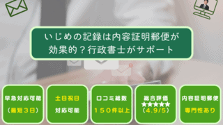 内容証明いじめの記録は内容証明郵便が効果的?行政書士がサポート いじめの事実の詳細な記録は、証拠として残す目的でもとても重要です。特に、内容証明郵便を活用することで、いじめの事実を公式に伝え、相手に対して法的なプレッシャーを与えることが可能となります。本記事では、いじめの記録の重要性とその方法、さらに内... 2025.04.06いじめ内容証明